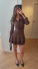The Alba Dress - A brown mini dress designed to captivate with effortless sophistication. Featuring a subtle shimmer throughout the fabric, it catches the light beautifully, using our best-selling Ivy Dress fabric. The deep waistband defines the figure, while the flared skirt with soft layered ruffles creates graceful movement. Long fitted sleeves and a classic button-down bodice lend timeless elegance, making it a versatile piece for both holiday gatherings and sparkling nights out. This dress is your go-to for chic seasonal dressing.